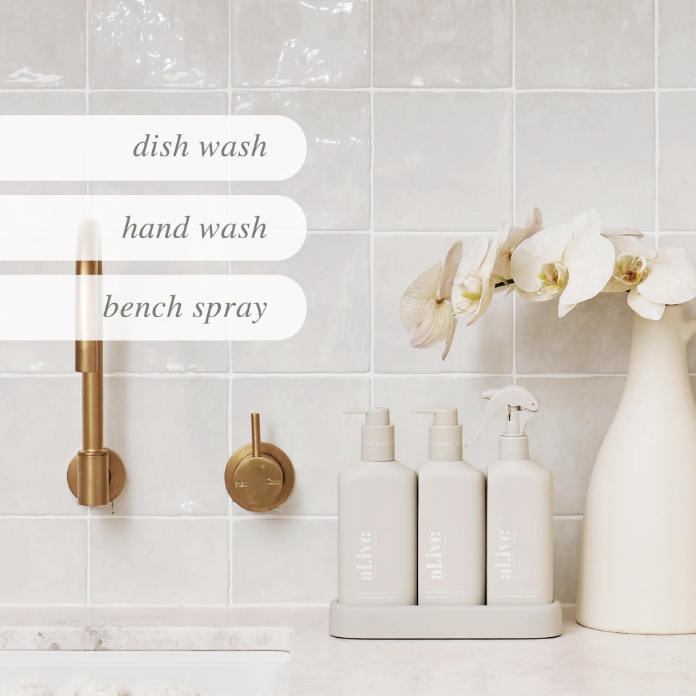 The al.ive body Dishwashing Liquid, Hand Wash & Bench Spray Kitchen Trio is a beautiful yet practical product, elegantly packaged to elevate your countertop.