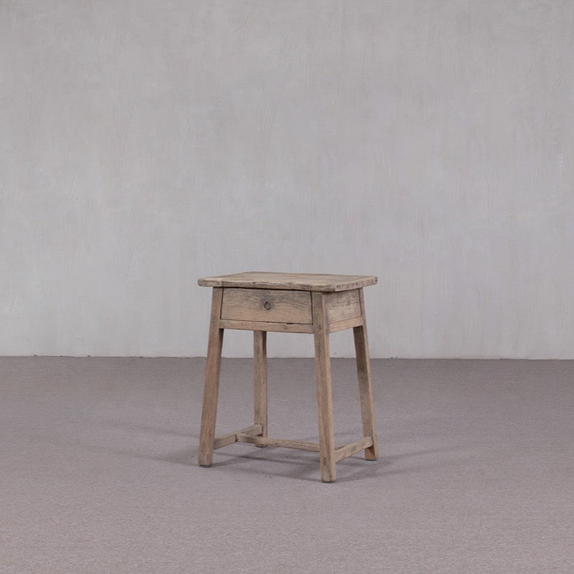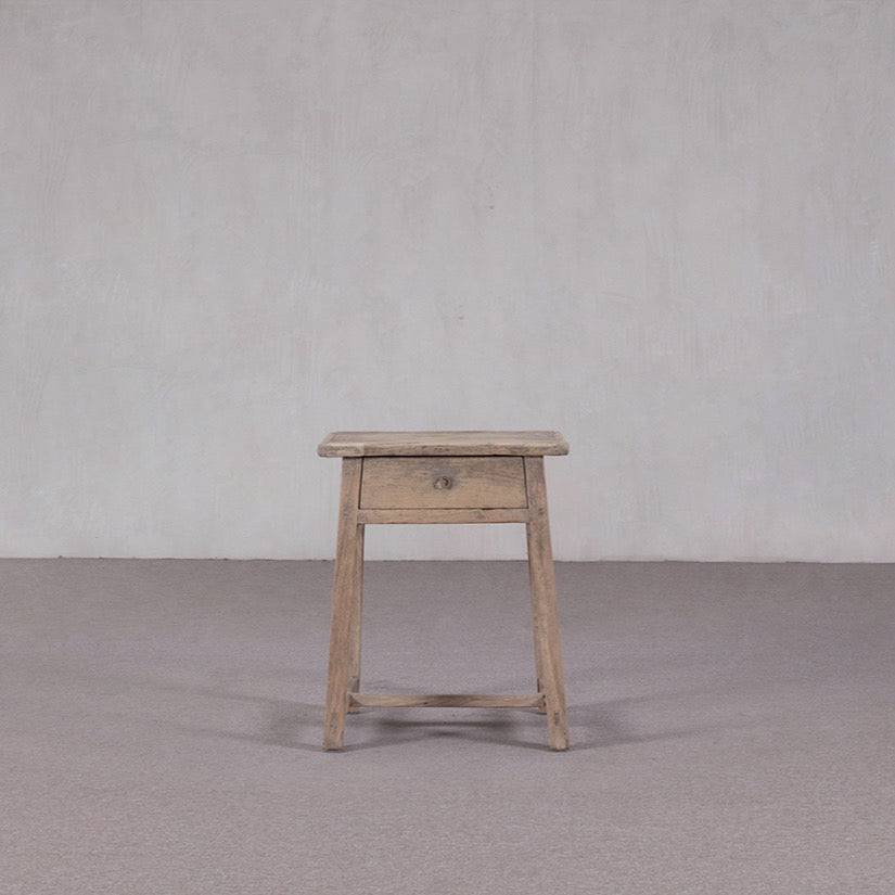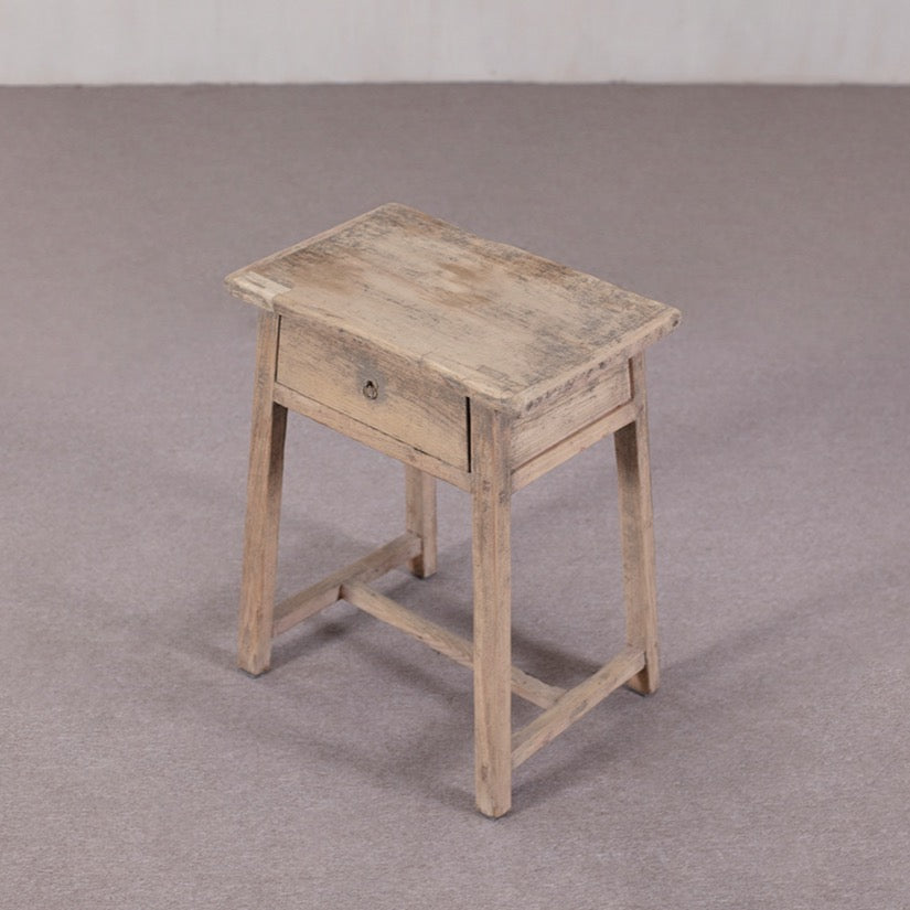 Small side table made from reclaimed pine sourced from the Shandong region, featuring a single drawer and finished in natural/rustic tone.